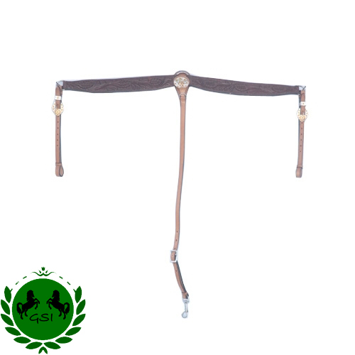 This is a gorgeous breast collar constructed of High quality thick 100% bridle leather, carefully hand-made with all the required precision to give the most unique look on an arena or a trail. The edges are all hand-dyed and the hardware used is solid Stainless Steel with excellent sparkling finish. They are ideal for a standard size horse and have some room for adjustments.